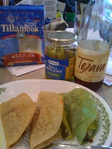 Tastes better than it sounds! Ground beef and pickle tacos. Ground beef cooked with taco seasoning mix ( 2lbs. meat and 2 pkgs taco seasoning mix), served in white corn tortillas and white corn/nopales tortillas! Add dill pickles and cheese and……Ta Dah! Ground beef and pickle tacos, kind of like those at http://www.malorestaurant.com/Theirs are still better, but these are good!Shirley brought me the tortillas from a grocer in Imperial Valley, they are waaaaaaaaay good and fresh. Thank you Shirley!Leave a comment