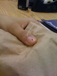 These are my friends from across the hall giving me a group hug for School Nurse Day! They also brought us cards that they made, we have them all up on the bulletin board. They also made a GIANT size card that was on the wall by our front door. It is inside now, I think I will find a place to hang it permanently on the wall. The last week has been a very difficult one, and it is nice to see something like their cards on the wall, they make me feel appreciated and happy. The Principal and Assistant Principals brought us loaves of bread from Kneaders and a couple of REALLy nice gift certificates from Kneaders too. I know they appreciate us! (even though I think I sent home about 1/2 of the student body today with flu like symptoms)And this is an unlucky seamstress. See the little red dot on her nail that has the thread coming out of it?It is threaded through the tip of the sewing machine needle, which is buried in her thumb. She had to have surgery with general anesthesia to remove it. Ouch! When her fabric gets stuck next time, she will probably not have her foot on the presser foot of the machine.
