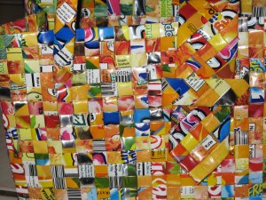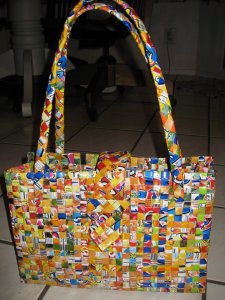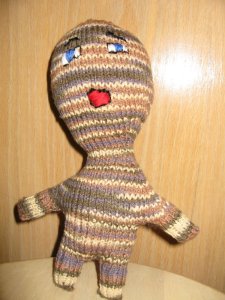 Hi there knitting buddies! Hope your summer is going well–seems like it gets shorter every year. I bought this bag at Wildfiber in Santa Monica at the beginning of the summer. I have seen these bags there before and resisted, but this time I couldn’t stand it. It is made from Capri sun type juice drink containers. Check out the company’s website at rebagz.com.By the way—Wildfiber in Santa Monica—best yarn store EVER! We must plan a trip. We could be in Santa Monica in 4 hours if we left on a Friday, spend some quality time at Wildfiber on Saturday, eat ground beef and pickle tacos at Malo in Silverlake for a late lunch, and be back home by 9. I feel a field trip coming! They have an actual “wall o’Koigu”, an adjacent “wall o’cashmere”, and just about anything else you want. Plus some stuff you didn’t know you wanted. We will discuss later………..The close up here shows that they use everything, even the nutritional labels and the silver part of the bag. The website shows some bags that are all silver. For the life of me, I can’t figure out how they did it. There is no evidence of a seam anywhere. You can carry it anywhere and set it down, it is impervious to yucky stuff on the ground. I bought it as a knitting tote (can you ever have enough?) and have been using it as a purse.Here is Mr. Stripey Head, made as part of Jackson’s first birthday present. He is from the book “the Knitted Odd-bod Bunch” by Donna Wilson. Check this book out next time you are in a big bookstore or knitting store. He is made from some left over Cascade Fixation sock yarn. He and all of his buddies have really odd bodies (hence the name) and strange faces. The strange faces really are nice because my embroidery skills are less than perfect.