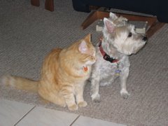 She came to live with Carson and I in May of 1993. Sunday, she was 16 years and 5 months when she left us. She outlived the odds in a big way. When she was 6, Tang came to live with us. He was a kitten. As you can see, Snuggy trained him well. They did a lot of things together, like taking catnaps, or dognaps.If you roll you cursor over the title, it will link you to my Flickr page with more photos.SometimesSnuggy got more of the birthday treats than Tang.
