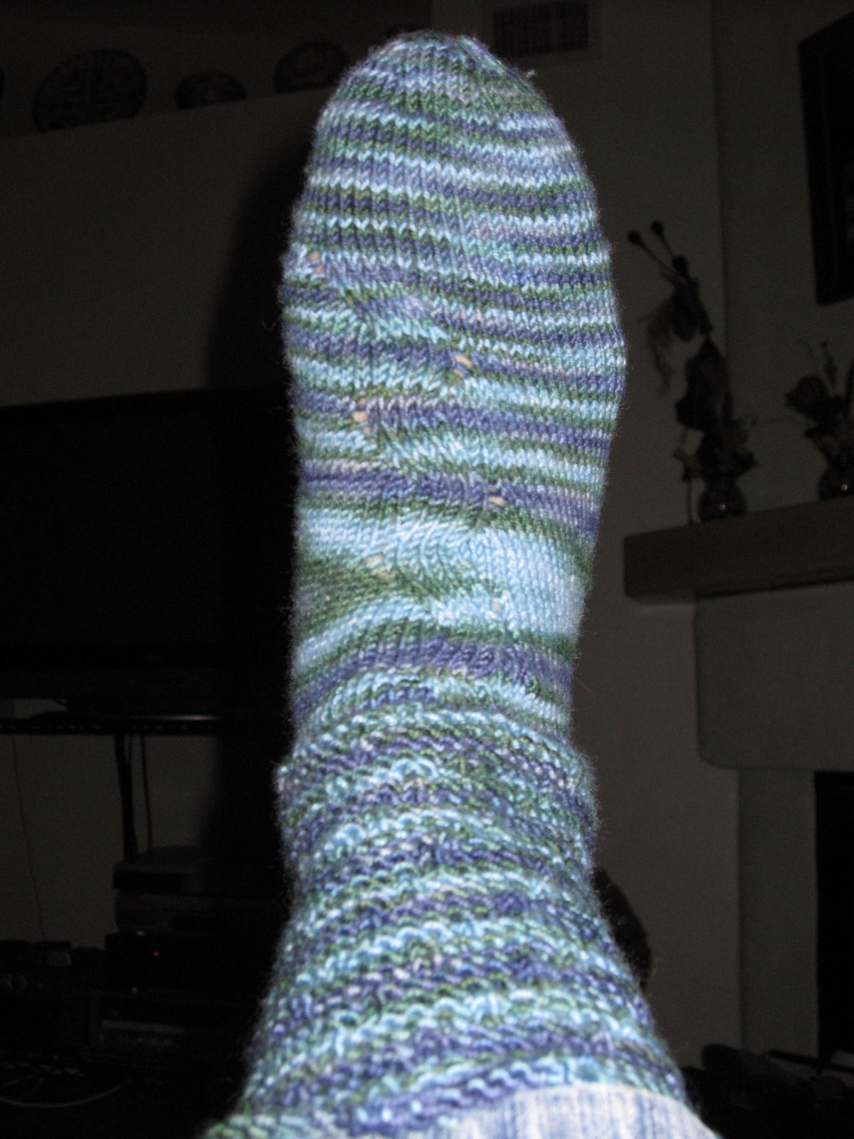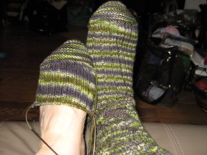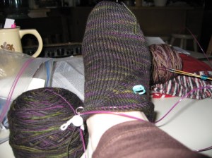 And I worked on both of these–the coriolis (the one on my foot) I started at Sock Camp and the Monkey KawKaw I started while under the influence of drugs, because if I was thinking clearly I surely would not have cast on yet another pair of socks. Or technically, a sock, since for some reason I am doing only one, another clue that my thinking is clouded.
